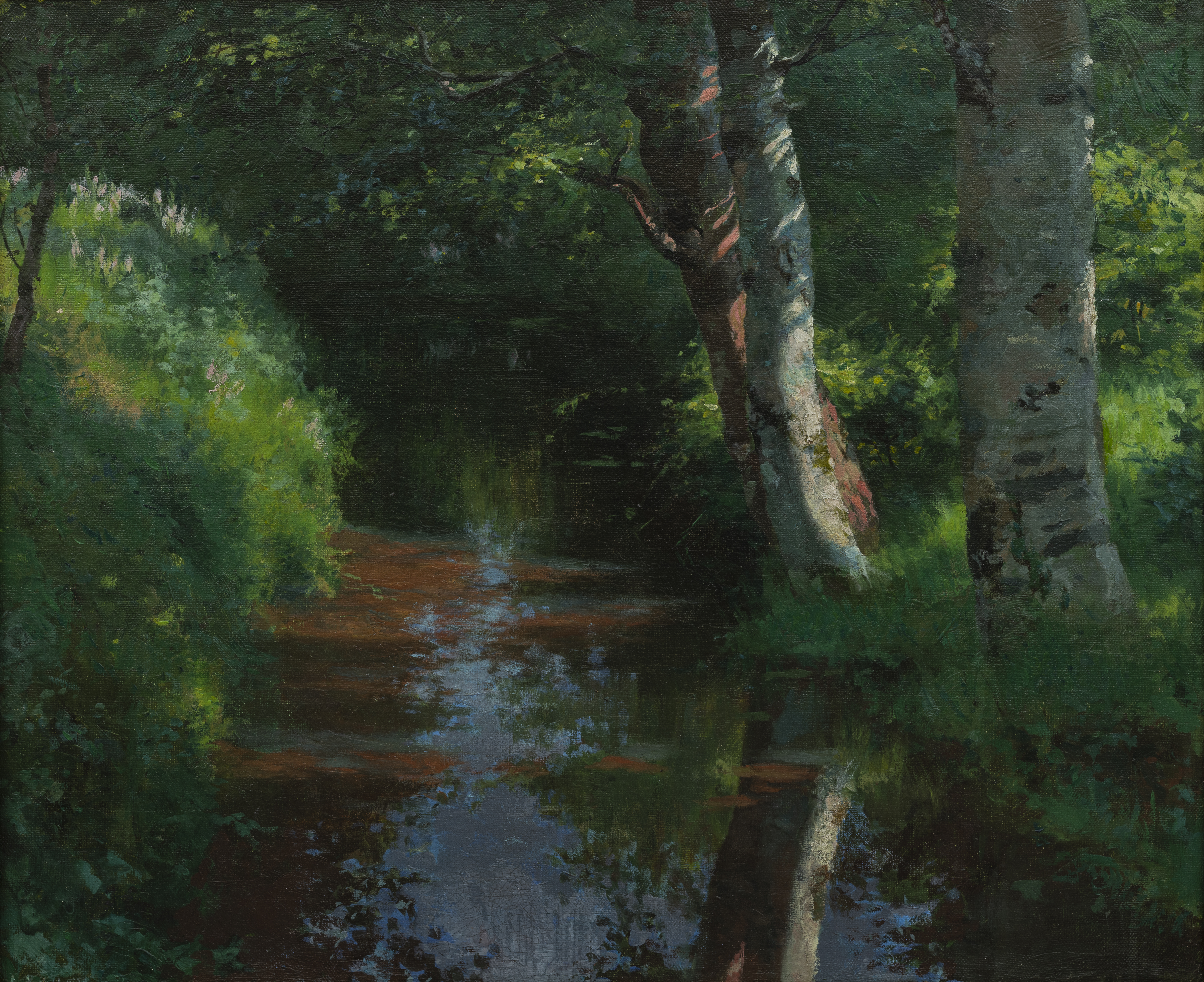 Comme tous ses paysages, celui-ci aussi a très certainement été peint en atelier et non d’après nature. Il résulte donc d’une activité autant d’observation que de transfiguration. Ici, Louis Rivier focalise son attention sur le rendu atmosphérique et sur les effets de la lumière sur la couleur. Le geste du peintre est rapide, libre et fait vibrer la composition. L’artiste utilise à la fois la pointe et la touffe du pinceau selon l’effet qu’il désire obtenir. L’arrière-plan, mystérieux et engloutissant le ruisseau, invite le spectateur à entrer par son regard et son imagination au cœur de cette forêt silencieuse.